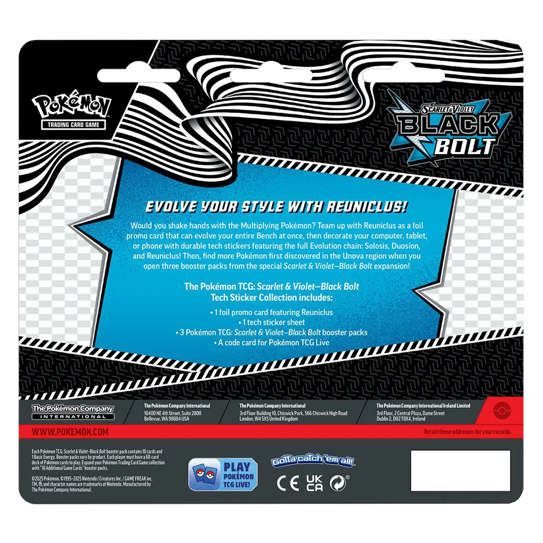 Would you shake hands with the Multiplying Pokémon? Team up with Reuniclus as a foil promo card that can evolve your entire Bench at once, then decorate your computer, tablet, or phone with durable tech stickers featuring the full Evolution chain: Solosis, Duosion, and Reuniclus! Then, find more Pokémon first discovered in the Unova region when you open three booster packs from the special Scarlet & Violet—Black Bolt expansion!