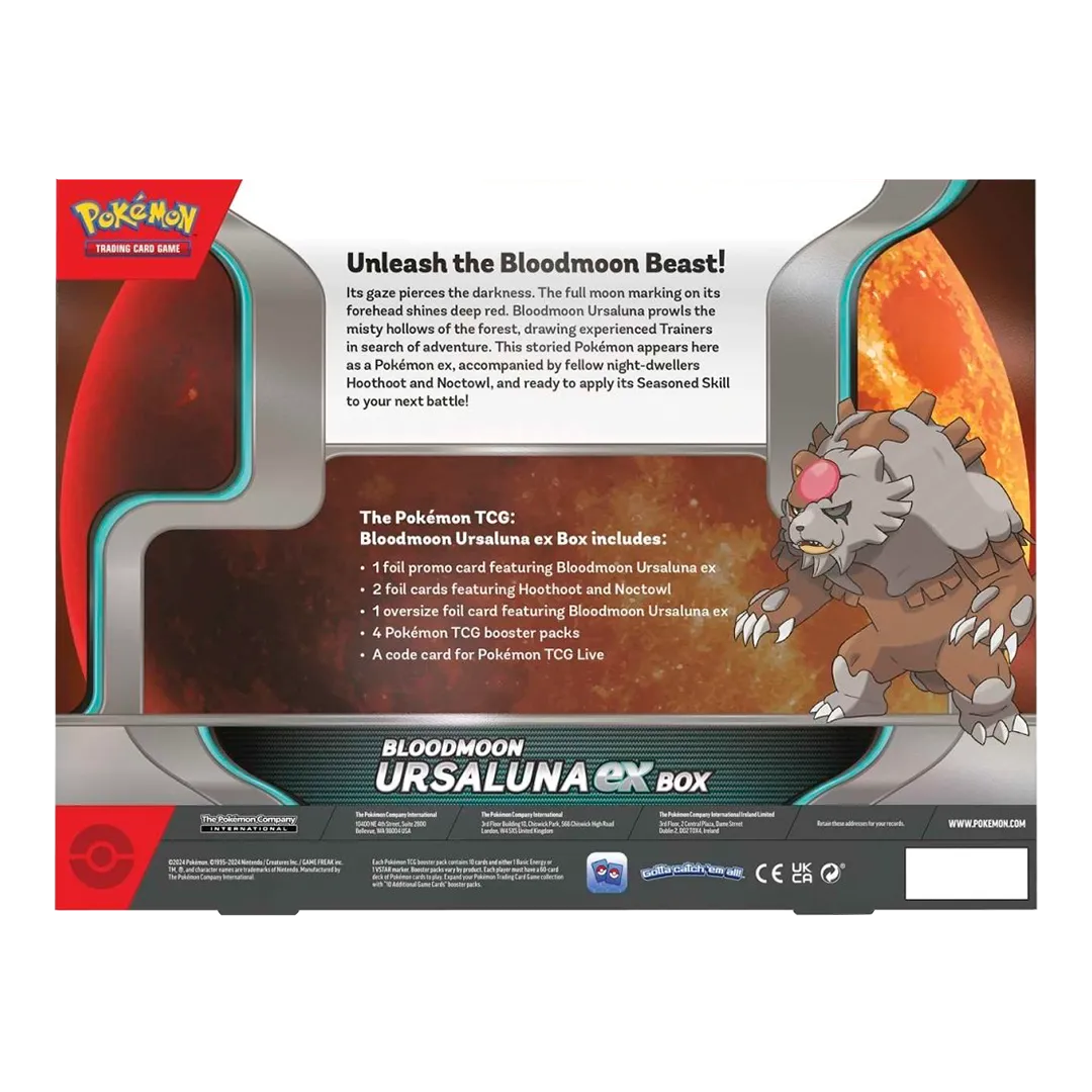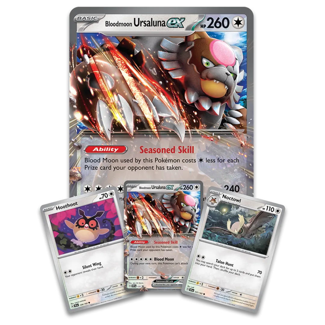 Its gaze pierces the darkness. The full moon marking on its forehead shines deep red. Bloodmoon Ursaluna prowls the misty hollows of the forest, drawing experienced Trainers in search of adventure. This storied Pokémon appears here as a Pokémon ex, accompanied by fellow night-dwellers Hoothoot and Noctowl, and ready to apply its Seasoned Skill to your next battle!