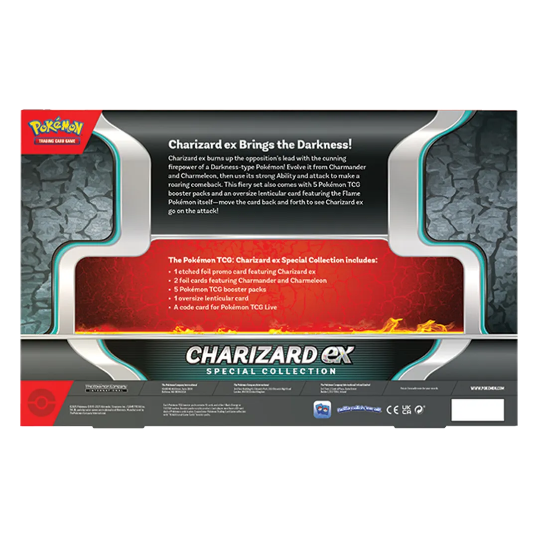 Charizard ex burns up the opposition’s lead with the cunning firepower of a Darkness-type Pokémon! Evolve it from Charmander and Charmeleon, then use its strong Ability and attack to make a roaring comeback. This fiery set also comes with 5 Pokémon TCG booster packs and an oversize lenticular card featuring the Flame Pokémon itself—move the card back and forth to see Charizard ex go on the attack!