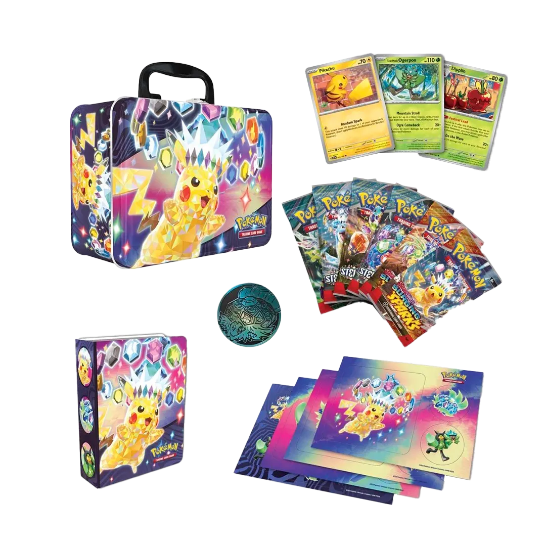 • 6 Pokémon TCG booster packs (Usually includes 2 Surging Sparks packs from our experience)• 3 foil cards featuring Pikachu, Dipplin, and Teal Mask Ogerpon• 1 Pokémon coin featuring Terapagos• 4 colorful sticker sheets• 1 mini portfolio to store your favorite cards• 1 code card for Pokémon TCG Live