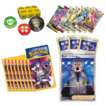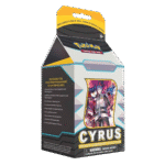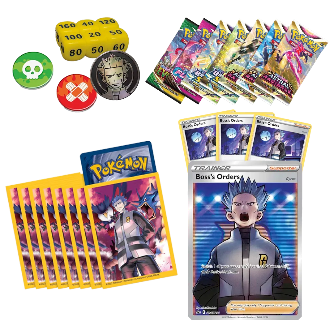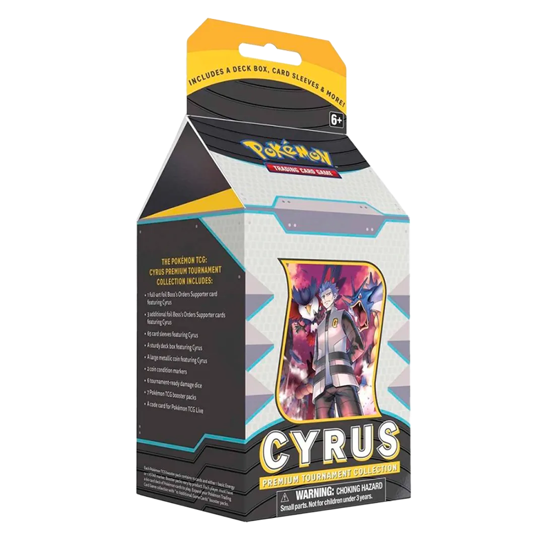 • 1 full-art foil Supporter card featuring Cyrus• 3 additional foil Supporter cards featuring Cyrus• 65 card sleeves featuring Cyrus• A sturdy deck box featuring Cyrus• A large metallic coin featuring Cyrus• 2 coin condition markers• 6 tournament-ready damage dice• 7 Pokémon TCG booster packs• A code card for Pokémon TCG Live