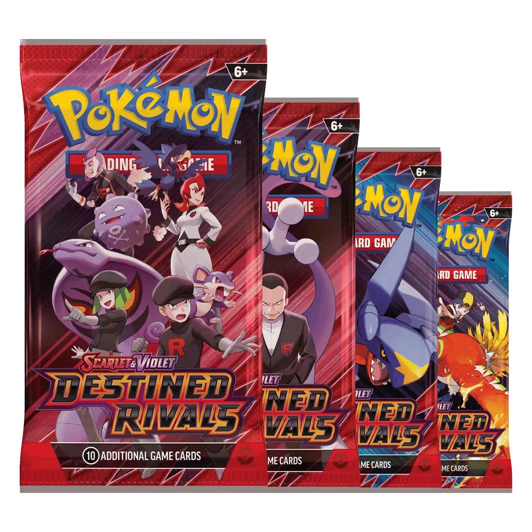 Whose Side Are You On? Pokémon Trainers, be on high alert! The nefarious Team Rocket is setting its latest plan into motion, and heroic Trainers are racing to stop it. Join forces with the likes of Cynthia and Garchomp ex, Ethan and Ho-Oh ex, or Arven and Mabosstiff ex… Or reconsider your loyalties and fight alongside Team Rocket’s Pokémon like Mewtwo ex—under the command of Giovanni! Choose a side, assemble your allies, and battle boldly in the Pokémon TCG: Scarlet & Violet—Destined Rivals expansion!