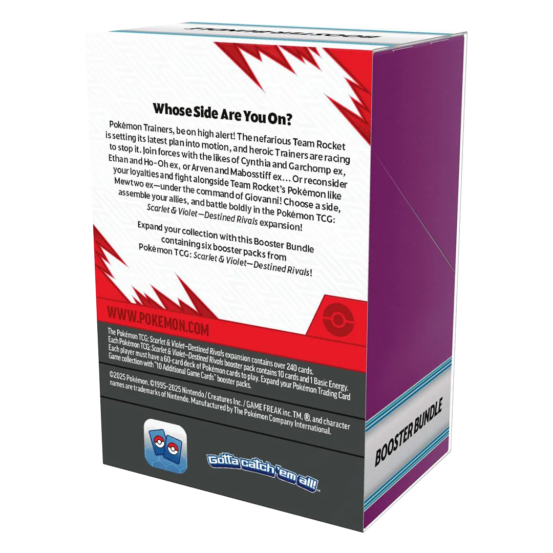 Whose Side Are You On? Pokémon Trainers, be on high alert! The nefarious Team Rocket is setting its latest plan into motion, and heroic Trainers are racing to stop it. Join forces with the likes of Cynthia and Garchomp ex, Ethan and Ho-Oh ex, or Arven and Mabosstiff ex… Or reconsider your loyalties and fight alongside Team Rocket’s Pokémon like Mewtwo ex—under the command of Giovanni! Choose a side, assemble your allies, and battle boldly in the Pokémon TCG: Scarlet & Violet—Destined Rivals expansion!