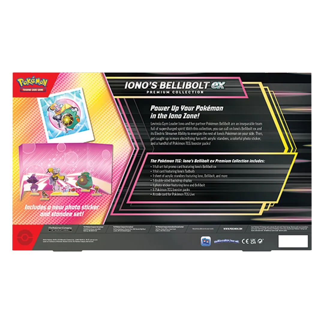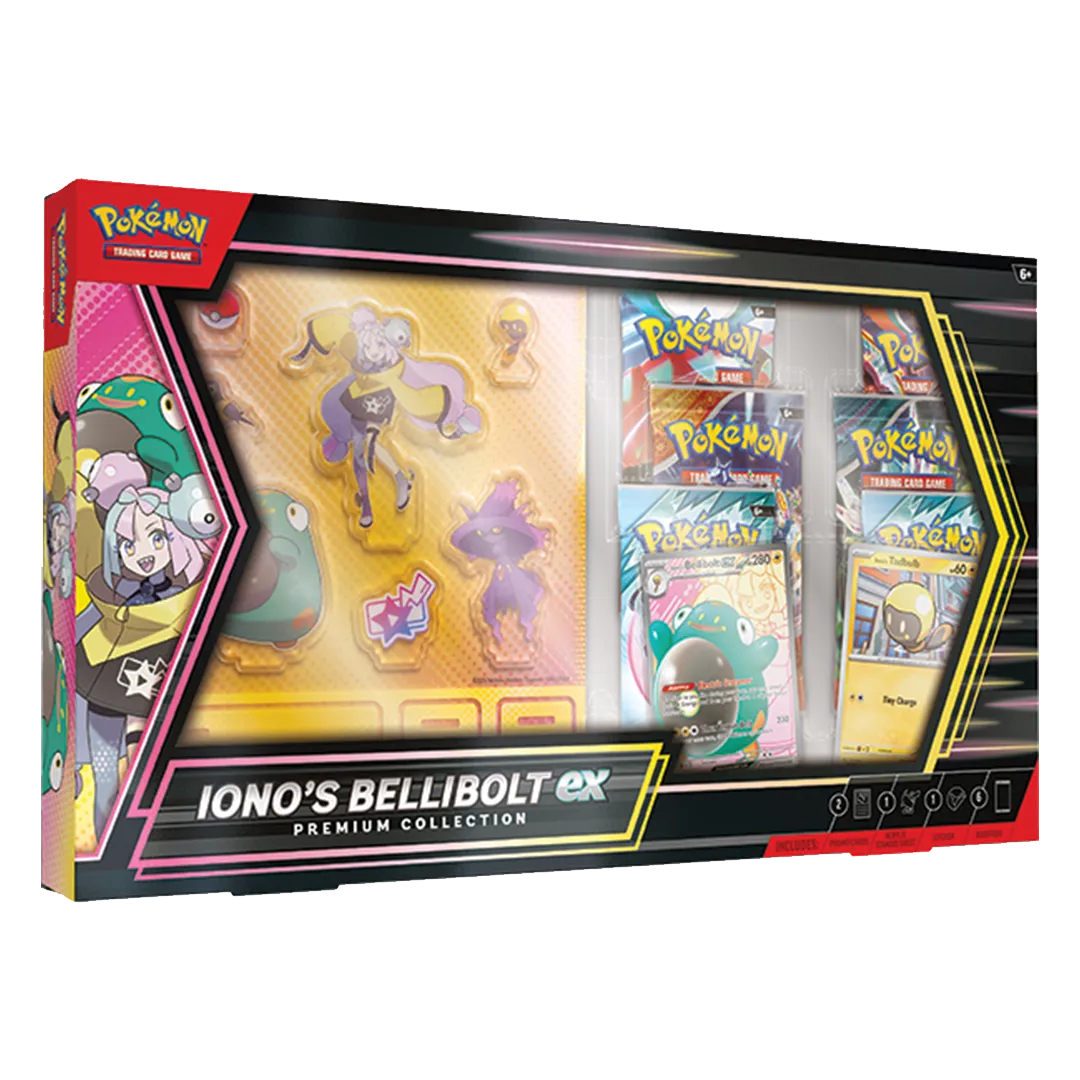 Levincia Gym Leader Iono and her partner Pokémon Bellibolt are an inseparable team full of supercharged spirit! With this collection, you can call on Iono’s Bellibolt ex and its Electric Streamer Ability to energize the rest of Iono’s Pokémon on your side. Then, get caught up in more electrifying fun with acrylic standees, a colorful photo sticker, and a handful of Pokémon TCG booster packs!Â
