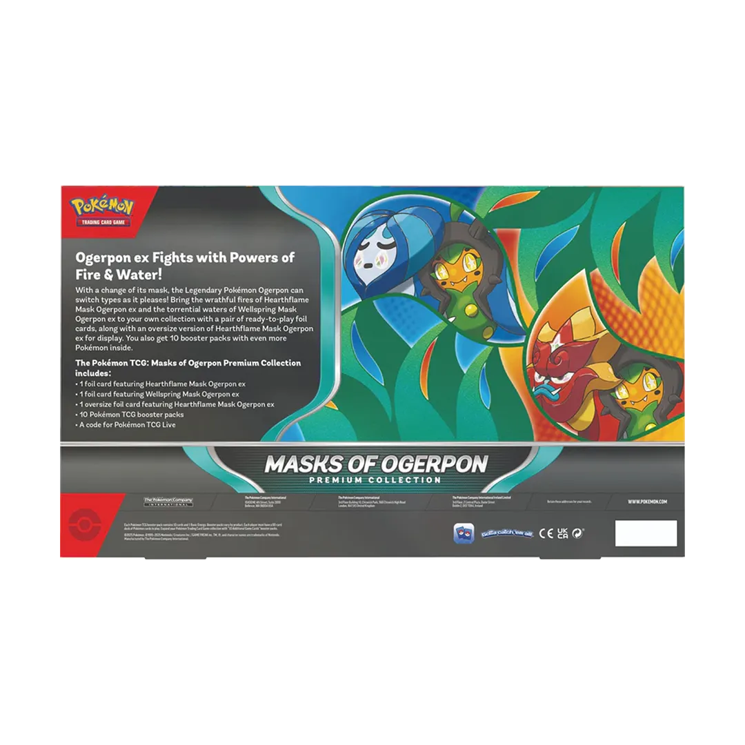torrential waters of Wellspring Mask Ogerpon ex to your own collection with a pair of ready-to-play foil cards, along with an oversize version of Hearthflame Mask Ogerpon ex for display. You also get 10 booster packs with even more Pokémon inside.
