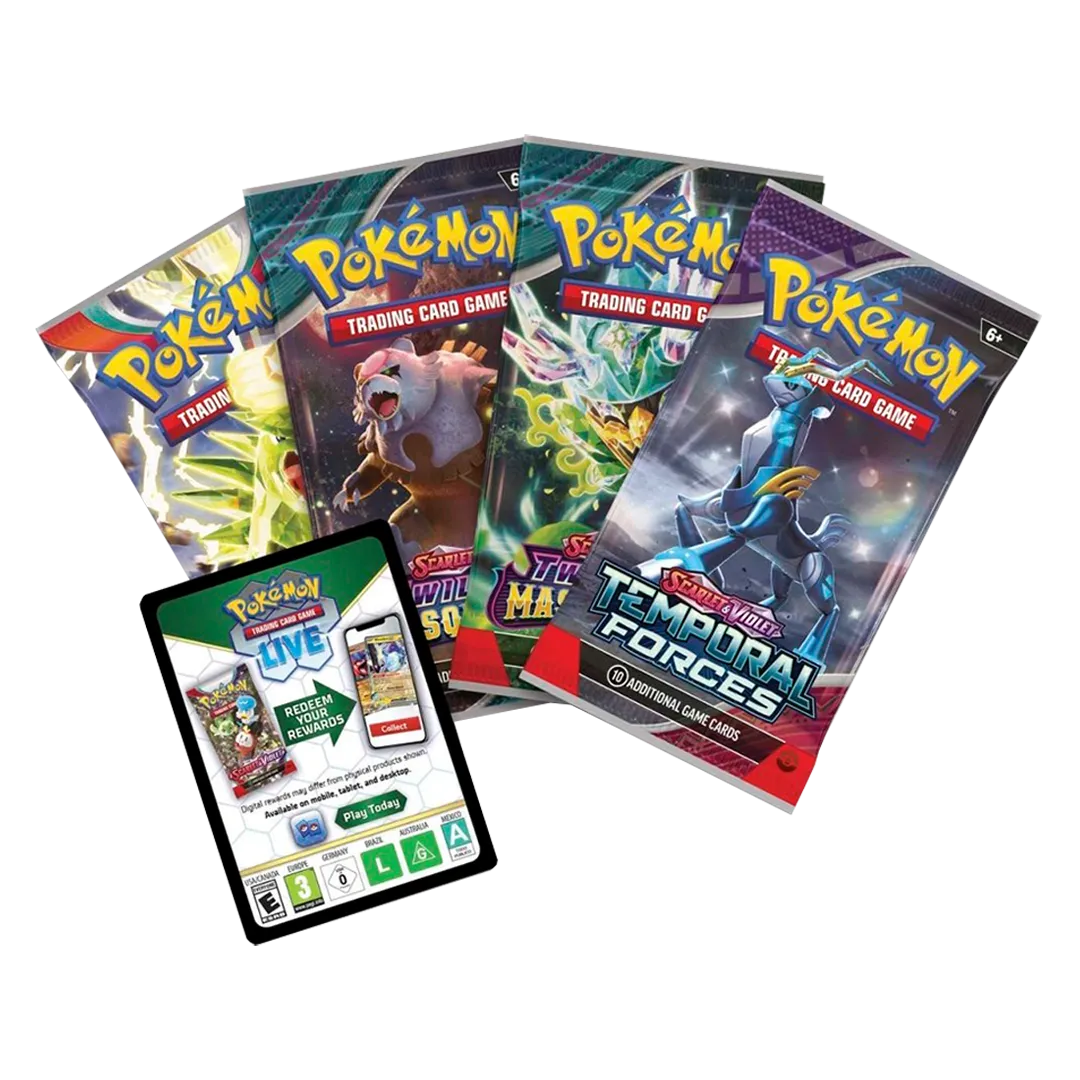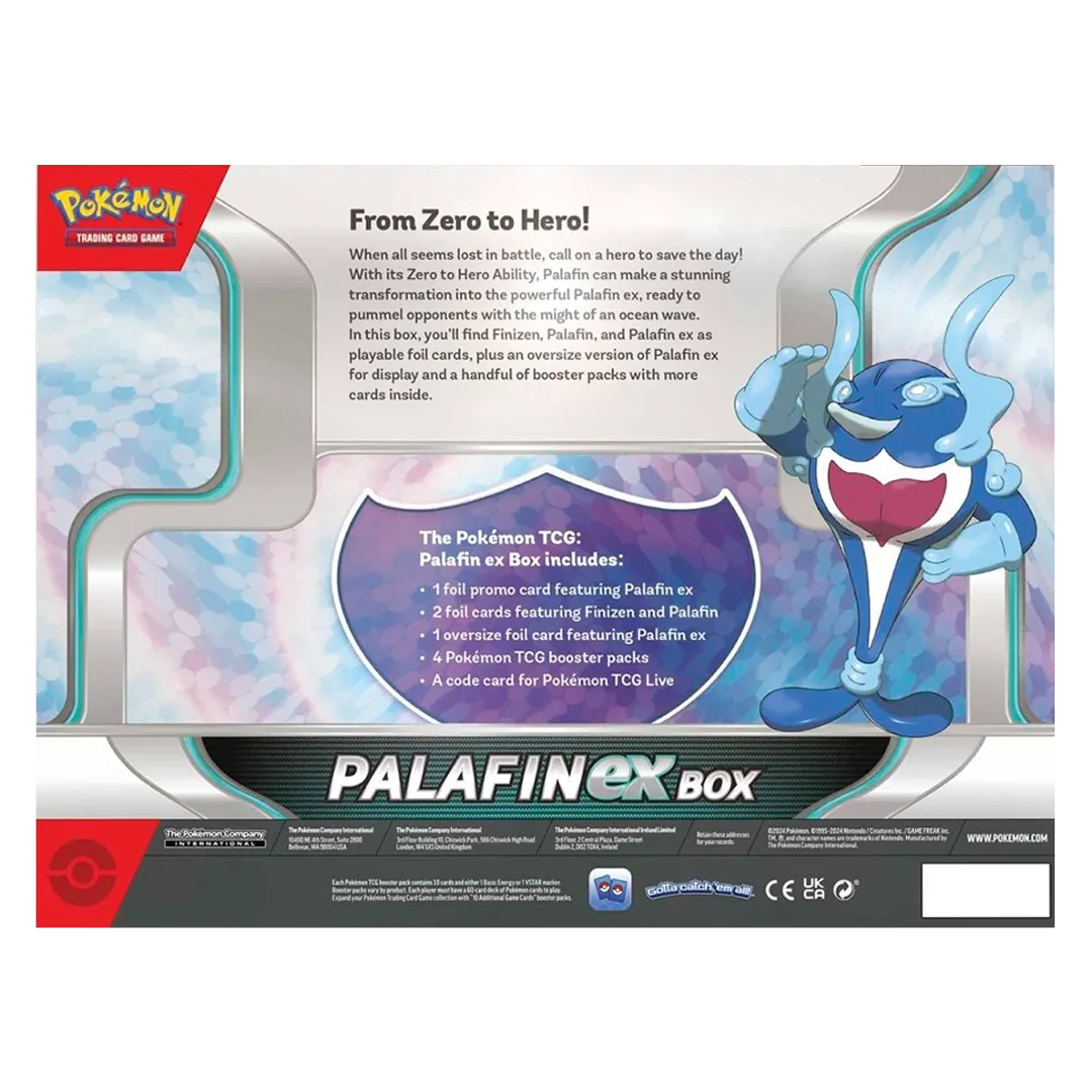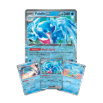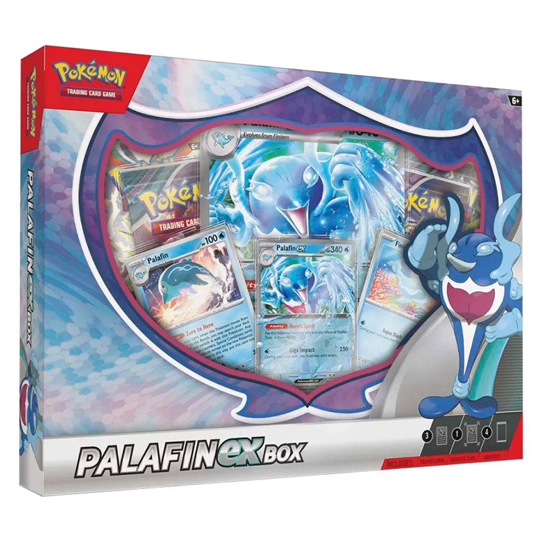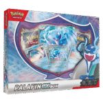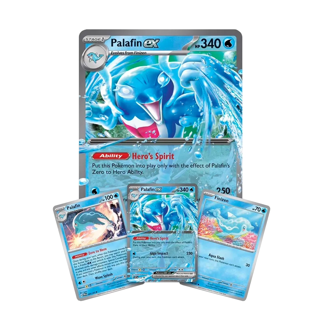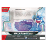 When all seems lost in battle, call on a hero to save the day! With its Zero to Hero Ability, Palafin can make a stunning transformation into the powerful Palafin ex, ready to pummel opponents with the might of an ocean wave. In this box, you’ll find Finizen, Palafin, and Palafin ex as playable foil cards, plus an oversize version of Palafin ex for display and a handful of booster packs with more cards inside.