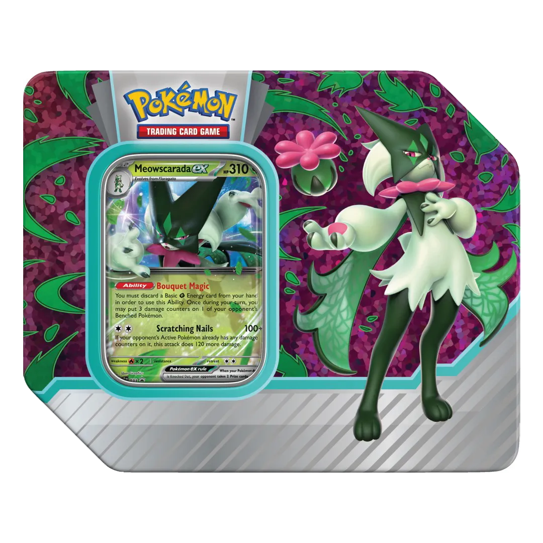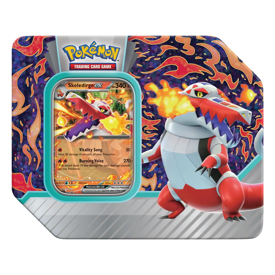 Command a rousing performance on the battlefield with a fully evolved first partner Pokemon ex! Choose the sneaky magic of Meowscarada ex, the fired-up singing of Skeledirge ex, or the dazzling dance moves of Quaquaval ex in the Pokemon TCG: Paldea Partners Tin. Then, find even more Pokemon for your team inside the included booster packs!