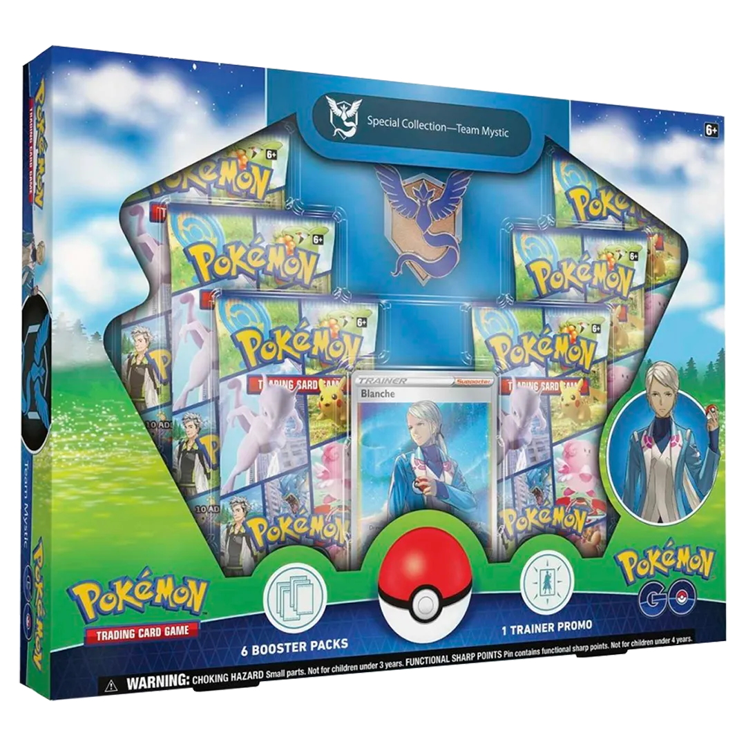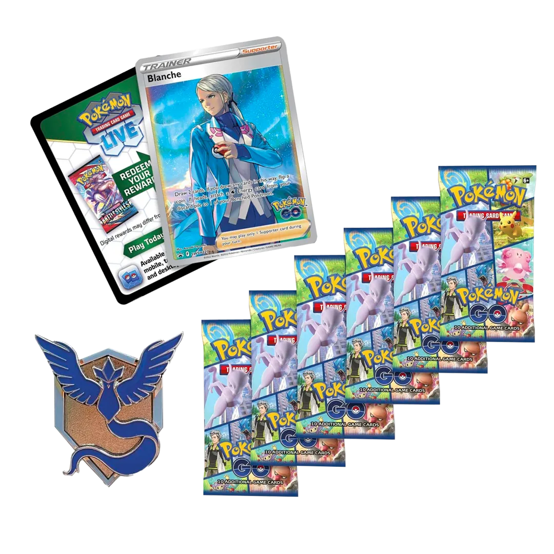 • A full-art foil promo card featuring Spark, Blanche, or Candela• A deluxe pin featuring the emblem of Team Instinct, Team Mystic, or Team Valor• 6 Pokémon GO booster packs• A code card for Pokémon TCG Live