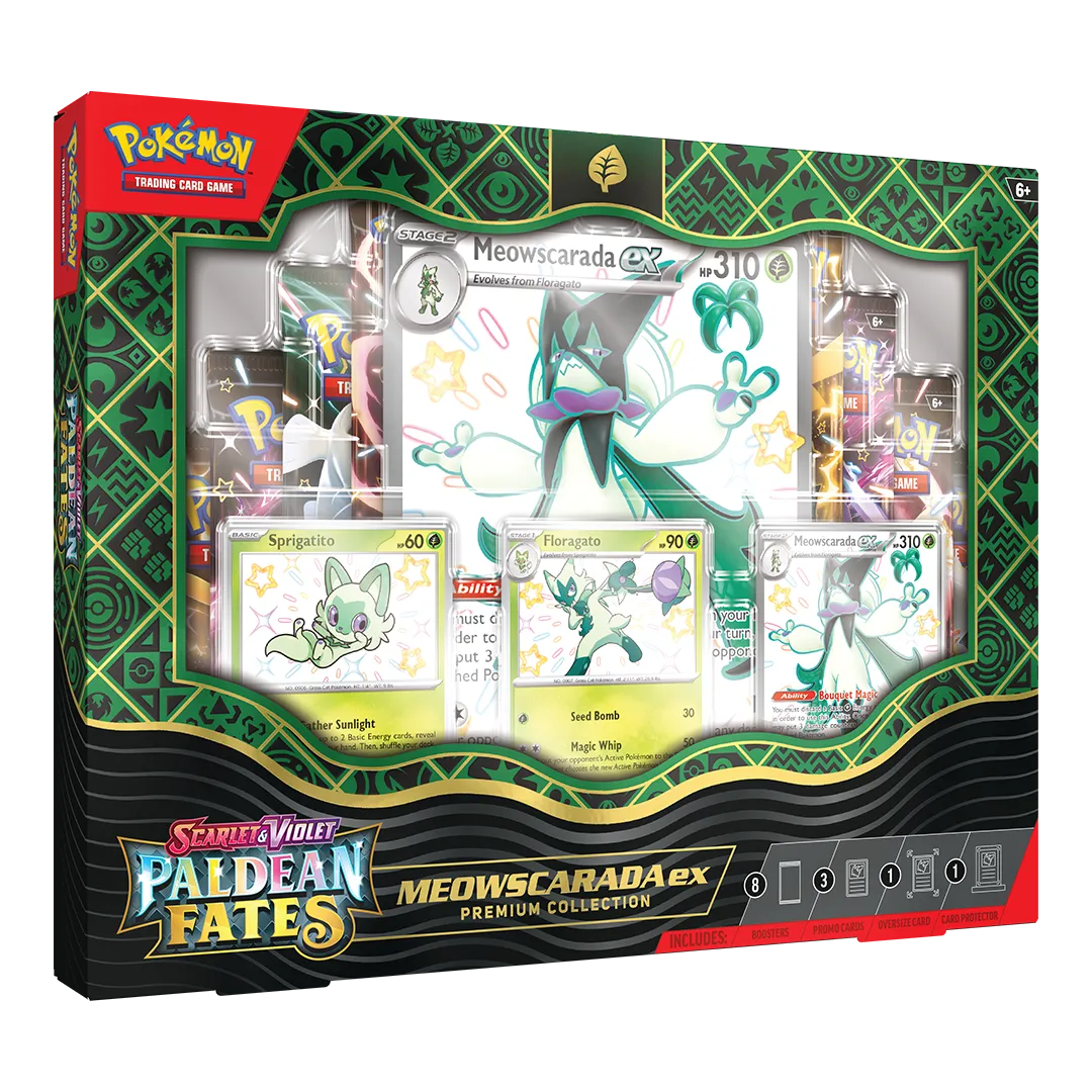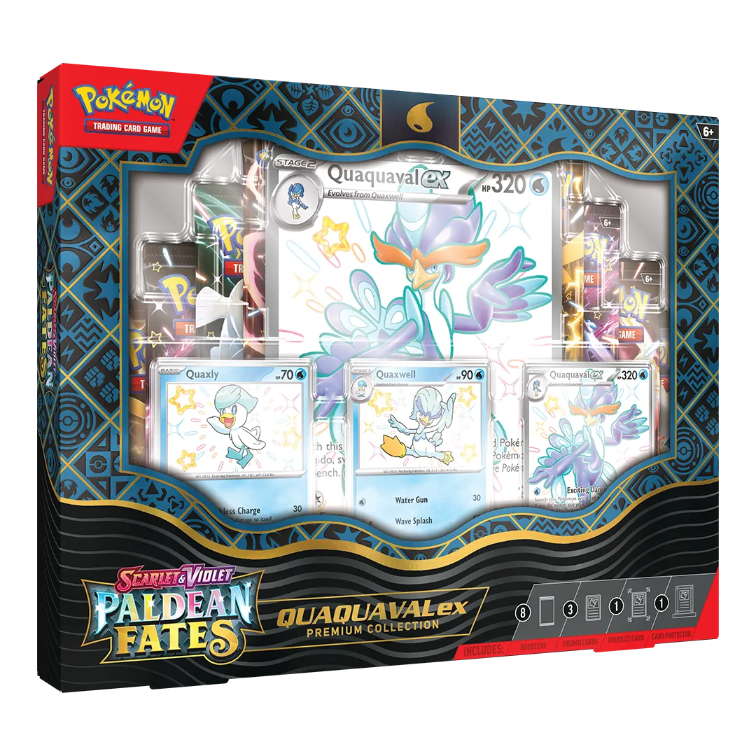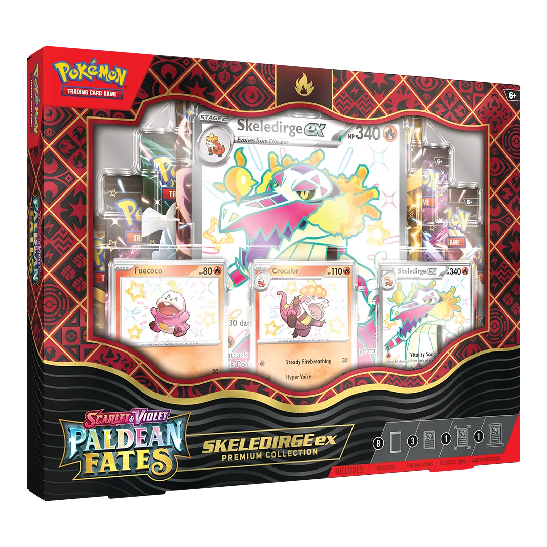 • 8 Pokémon TCG: Scarlet & Violet—Paldean Fates booster packs• 1 etched foil promo card featuring Shiny Meowscarada ex, Shiny Skeledirge ex, or Shiny Quaquaval ex• 1 etched foil promo card featuring Shiny Floragato, Shiny Crocalor, or Shiny Quaxwell• 1 etched foil promo card featuring Shiny Sprigatito, Shiny Fuecoco, or Shiny Quaxly• 1 oversize foil card featuring Shiny Meowscarada ex, Shiny Skeledirge ex, or Shiny Quaquaval ex• 1 magnetic 3-card protector with base• A code card for Pokemon TCG Live
