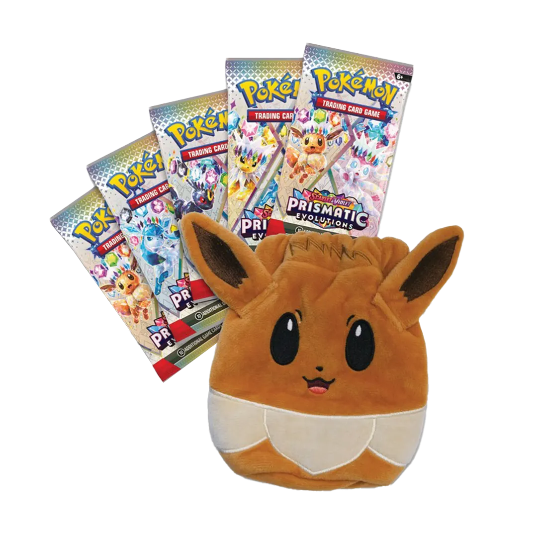 Cute, fuzzy, and full of charm, Eevee can bring a smile to the face of anyone it meets! With the soft accessory pouch in this collection, you can carry Eevee’s enthusiasm with you wherever you go, from Pokémon League to a day out on the town. Eevee’s big ears stand tall for a unique look, and the drawstring on top helps keep your coins and other accessories secure. Also included are booster packs from the special Scarlet & Violet—Prismatic Evolutions expansion, featuring more Pokémon fun inside!