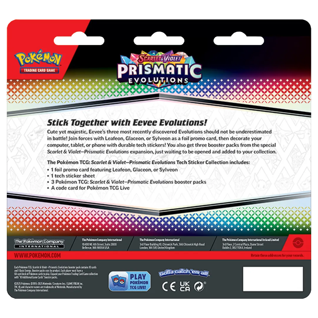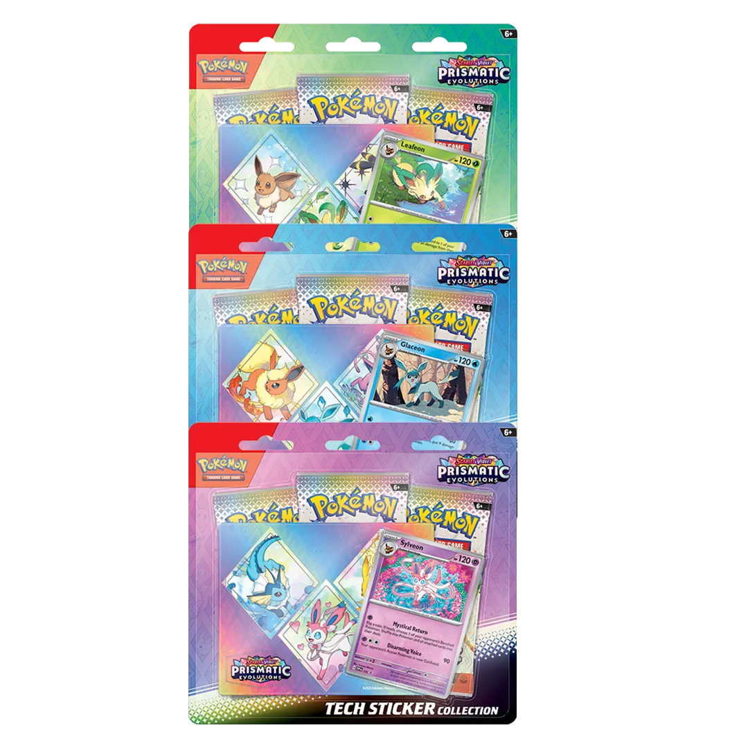 Cute yet majestic, Eevee’s three most recently discovered Evolutions should not be underestimated in battle! Join forces with Leafeon, Glaceon, or Sylveon as a foil promo card, then decorate your computer, tablet, or phone with durable tech stickers! You also get three booster packs from the special Scarlet & Violet—Prismatic Evolutions expansion, just waiting to be opened and added to your collection.