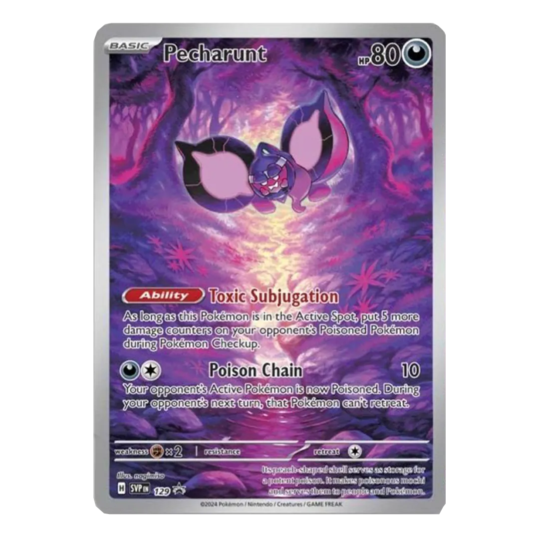 Rumors swirl and memories deceive as the march of time beats on in the land of Kitakami! Prepare for nightfall and discover a malevolent presence as Pecharunt ex commands the Loyal Three-Okidogi ex, Munkidori ex, and Fezandipiti ex-to do its nefarious bidding. Meanwhile, Revavroom ex plugs into the grid to Terastallize into a Lightning type, and Kingdra ex makes a royal splash in the Pokemon TCG: Scarlet & Violet-Shrouded Fable expansion!