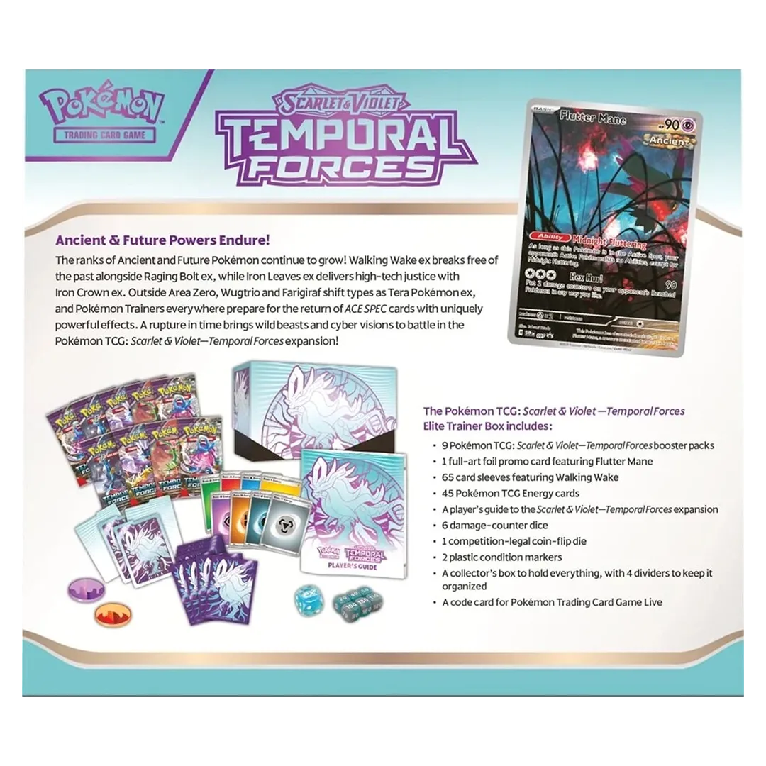 Walking Wake ex breaks free of the past alongside Raging Bolt ex, while Iron Leaves ex delivers high-tech justice with Iron Crown ex. Outside Area Zero, Wugtrio and Farigiraf shift types as Tera Pokémon ex, and Pokémon Trainers everywhere prepare for the return of ACE SPEC cards with uniquely powerful effects. A rupture in time brings wild beasts and cyber visions to battle in the Pokémon TCG: Scarlet & Violet—Temporal Forces expansion!