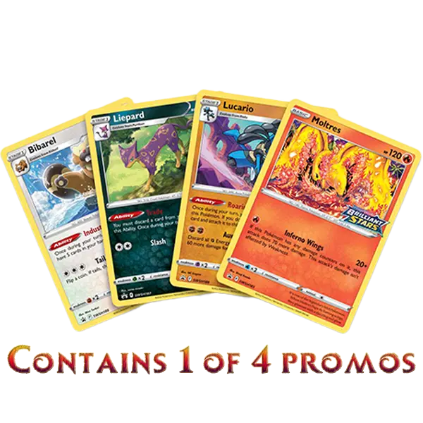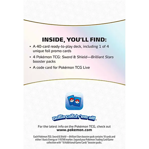 • 40-card ready-to-play decks• 1 of 4 promo cards• 4 Pokémon TCG: Sword & Shield—Brilliant Stars booster packs• 1 deck-building tip sheet