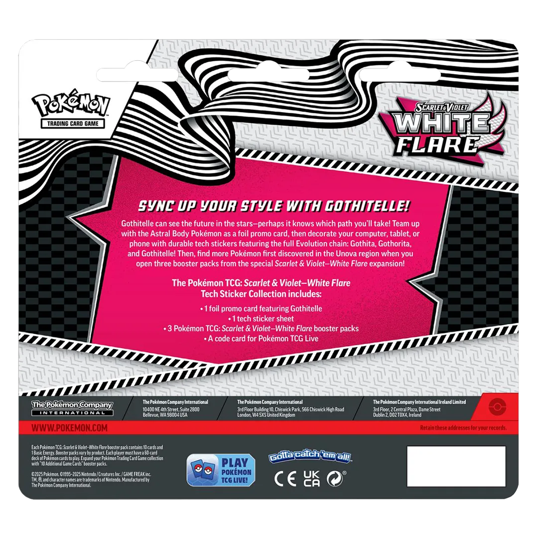 Gothitelle can see the future in the stars—perhaps it knows which path you’ll take! Team up with the Astral Body Pokémon as a foil promo card, then decorate your computer, tablet, or phone with durable tech stickers featuring the full Evolution chain: Gothita, Gothorita, and Gothitelle! Then, find more Pokémon first discovered in the Unova region when you open three booster packs from the special Scarlet & Violet—White Flare expansion!
